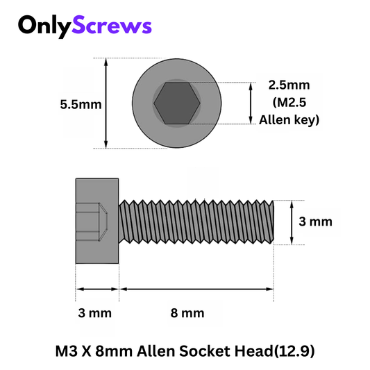 M3 X 8mm Hex (Allen) Socket Head High Tensile(12.9) Black oxide screw (Dia. 3mm, Length 8mm)